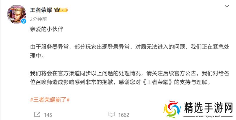 【21:40 更新】王者荣耀官微发文回应:由于服务器异常,部分玩家出现登录异常、对局无法进入的问题,我们正在紧急处理中。我们将会在官方渠道同步以上问题的处理情况,请关注后续官方公告,我们对给各位召唤师造成影响感到非常的抱歉,感谢您对《王者荣耀》的支持与理解。