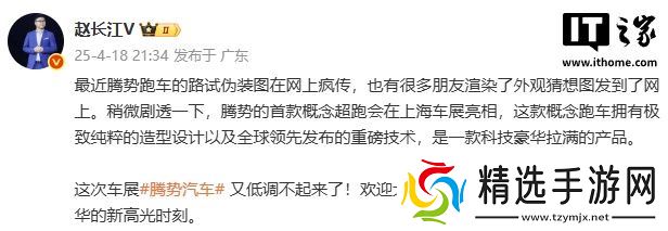 本站 4 月 18 日消息,比亚迪腾势销售事业部总经理赵长江今日发文称,腾势的首款概念超跑会在上海车展亮相,这款概念跑车拥有极致纯粹的造型设计以及全球领先发布的重磅技术,是一款科技豪华拉满的产品。