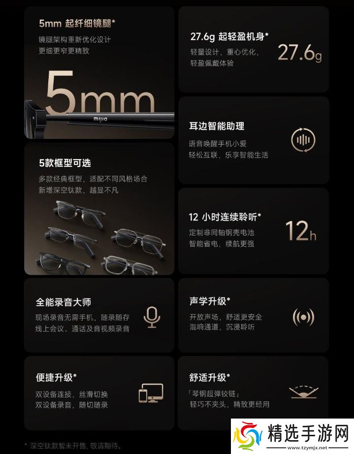 据介绍,小米 MIJIA 智能音频眼镜 2 采用轻量化设计,提供语音唤醒手机小爱、双设备连接、通知播报、双设备录音等功能,本站附产品亮点、参数信息如下: