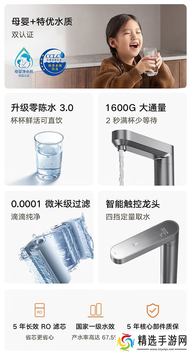 本站从商品页面获悉,这款新品支持 4.23 L / min 出水流速,实现 2 秒满杯,接满 1.5L 大汤锅也仅需 21.3 秒。镉去除率大于 99.8%,铅去除率大于 99.9%,大肠杆菌去除率 100%。获得母婴级净水器认证,通过严格无双酚 A 测试;获得特优水质认证,通过近百项严苛水质测试。