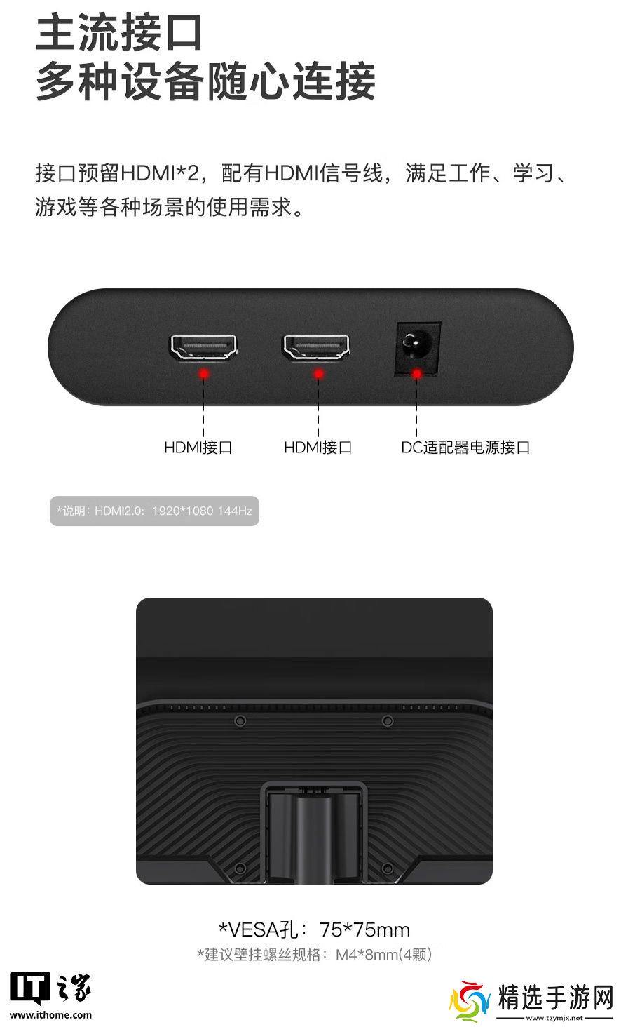 这款显示器支架不支持调节,不过显示器本体支持VESA 75×75mm壁挂,提供2个 HDMI 2.0接口。