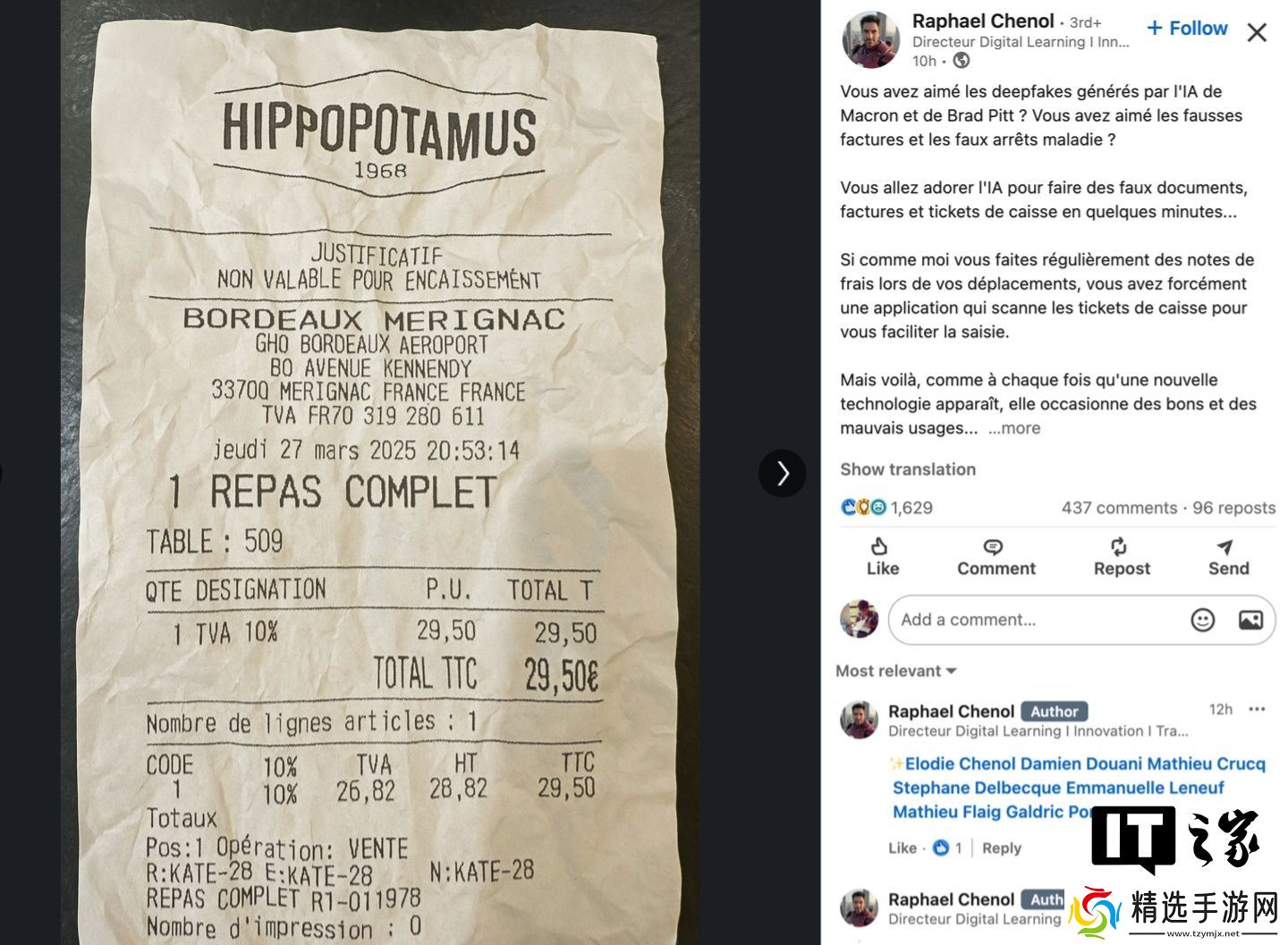社交媒体用户、风险投资家德迪・达斯在 X 平台上发布了一张他声称是用 4o 生成的旧金山一家真实牛排餐厅的假收据照片。随后,其他人也成功复制出了类似的结果,甚至有人添加了食物或饮料污渍,让收据看起来更加逼真。本站注意到,最逼真的例子之一来自法国,一名领英用户发布了一张当地餐饮连锁店的皱巴巴的 AI 生成收据。