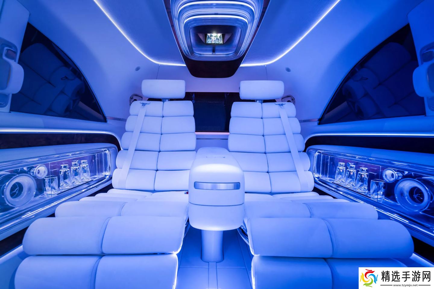 后排两张晶白 Nappa 皮革和丝绸制成的未来感休息椅可完全平躺,适合小憩。此外,折叠桌还能变身为棋盘,增添雅致娱乐选择。