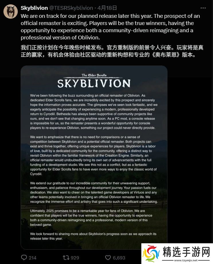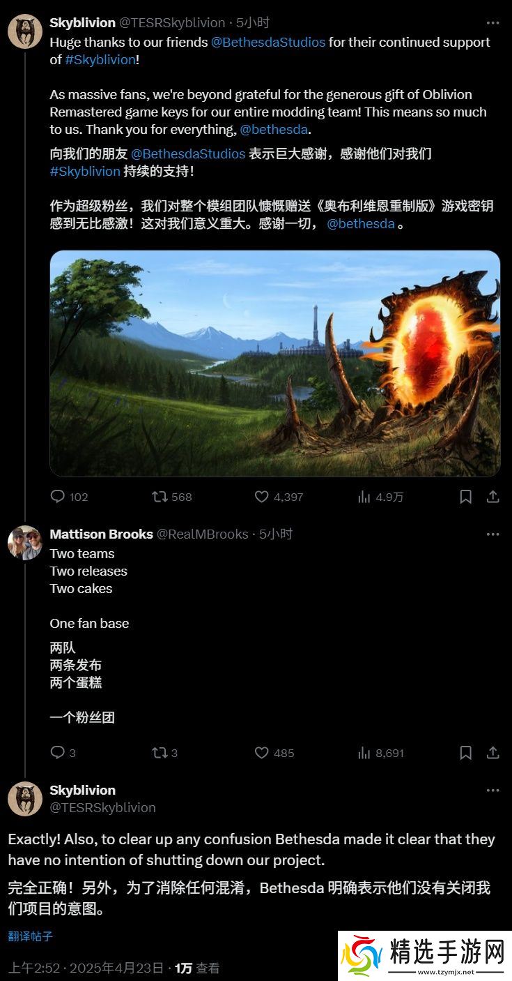 官方下场重制后,Skyblivion 今日发布声明称,B 社明确表示他们没有关闭民间项目的意图,甚至向整个 MOD 团队慷慨赠送了《上古卷轴4:湮灭 重制版》的游戏密钥。
