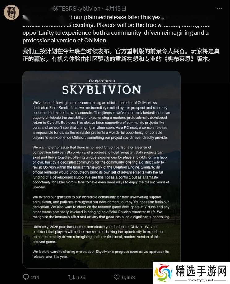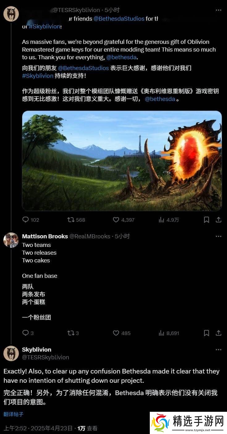 然而,随着官方重制版的发布,许多玩家担心《Skyblivion》项目会受到影响。但令人惊喜的是,Bethesda明确表示他们并没有关闭民间项目的意图,并且慷慨地向整个MOD团队赠送了《上古卷轴4:湮灭 重制版》的游戏密钥。这一举动无疑为粉丝社区注入了极大的信心和动力。