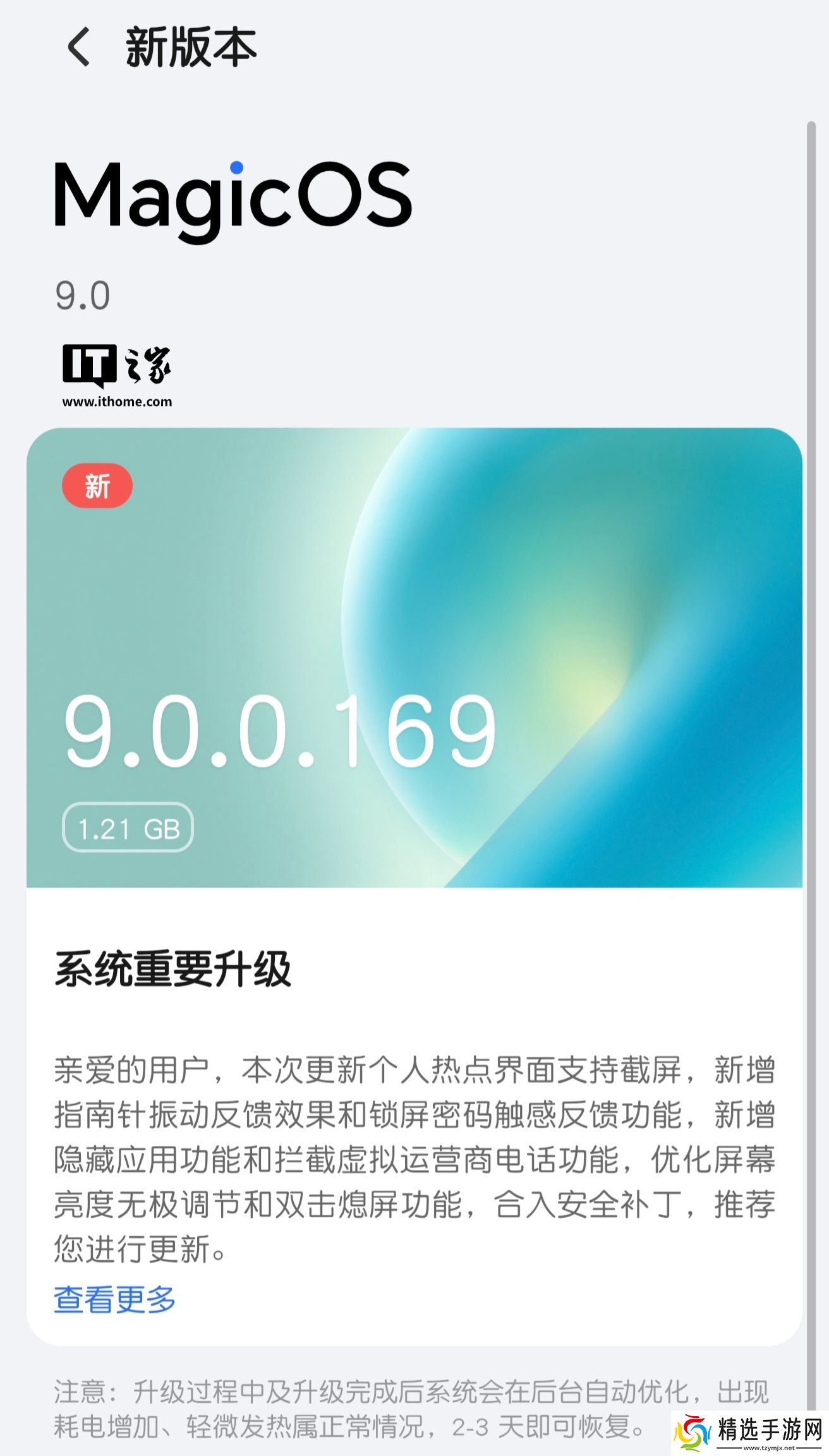 本站 4 月 24 日消息,荣耀 Magic5 / 6 系列等机型今日获 MagicOS 9.0.0.169 升级,系统包大小约 1.21GB,新增指南针振动反馈效果和锁屏密码触感反馈、隐藏应用、拦截虚拟运营商电话、支持 UltraHDR 格式照片高动态显示等功能。