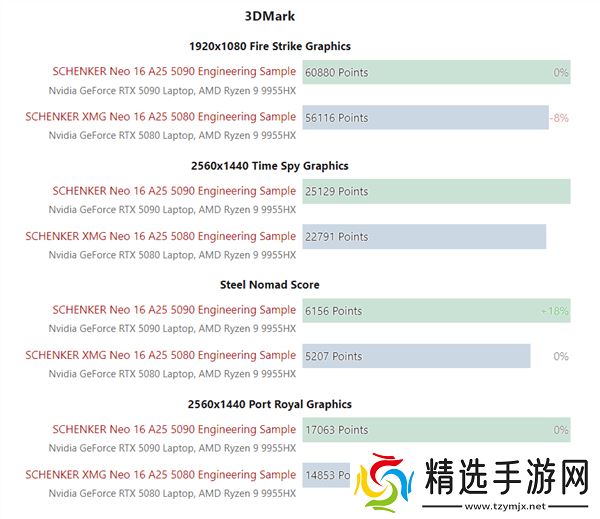 在具体测试场景中,一款配备了RTX 5080显卡的Schenker Neo 16笔记本,在3DMark基准测试中的得分,显著低于同系列搭载RTX 5090显卡的机型,差距同样在10%至15%之间。这一结果进一步证实了上述性能差异的存在。