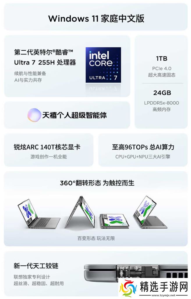 新品搭载联想专利第四代天工铰链,多挡位离合式设计,精准匹配旋转姿态控制轴体运动,支持 360° 任意悬停。全高清 1080P 摄像头,搭配矩阵式降噪麦克风。