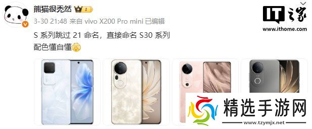 本站 4 月 4 日消息,博主@熊猫很禿然 近日爆料称,vivo S 系列手机跳过 21 命名,直接命名 S30 系列。该博主还晒出蓝、金、粉、黑四款配色,并称“配色懂自懂”。至于这款新机的具体规格,该博主暂未透露。