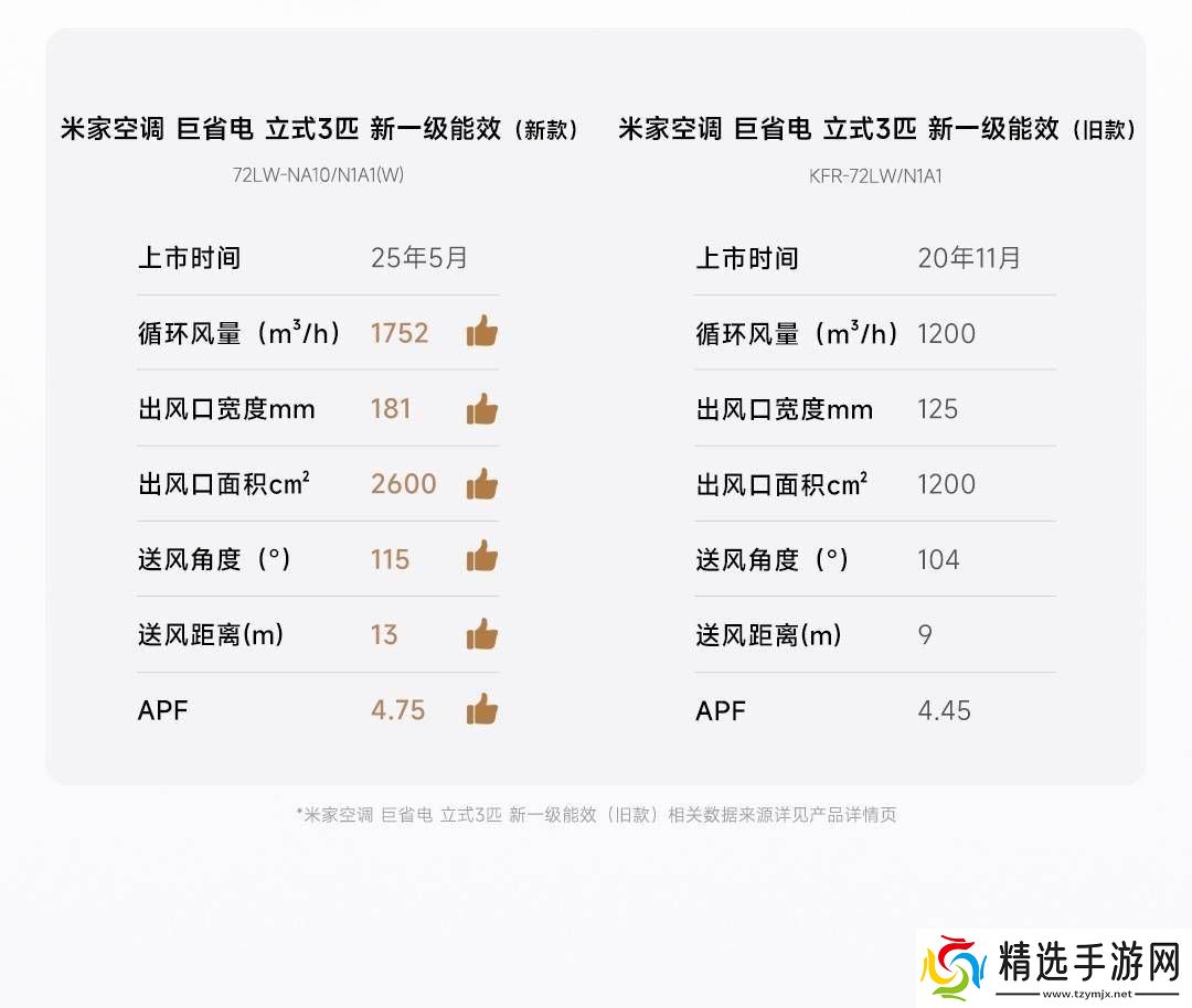 与2020年的旧款相比,米家空调巨省电立式3匹新一级能效在多个方面实现了显著提升。循环风量、出风口宽度、出风口面积、送风角度、送风距离以及APF(年度性能系数)等关键指标均有所优化。这一系列的升级,使得新款空调在提供强劲制冷效果的同时,更加节能环保。