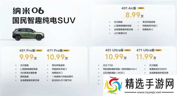 在配置方面,纳米06同样表现出色。除了标配的6扬声器、全景天窗、128色音乐律动氛围灯、后排空调出风口、后排中央扶手等功能外,还提供了360度全景影像、透明底盘、前方碰撞预警、车道偏离预警、车道保持辅助、道路交通标识识别、智能限速辅助、智能领航辅助等安全驾驶辅助功能。Ultra版车型更是升级了导航领航辅助驾驶、记忆领航辅助、盲区监测与变道预警、触发变道(拨杆变道TLC)、记忆泊车辅助(含跨层)、循迹倒车辅助等高级功能,为用户提供更加便捷、安全的驾驶体验。