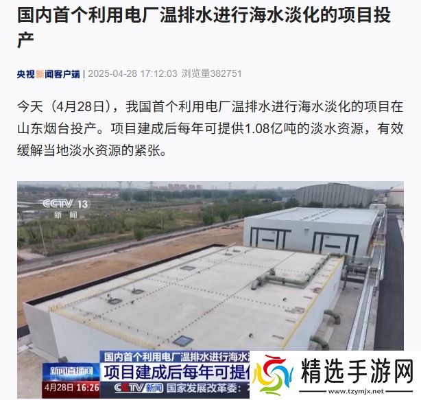 本站 4 月 29 日消息,据央视新闻报道,我国首个利用电厂温排水进行海水淡化的项目昨日在山东烟台投产。项目建成后每年可提供 1.08 亿吨的淡水资源。