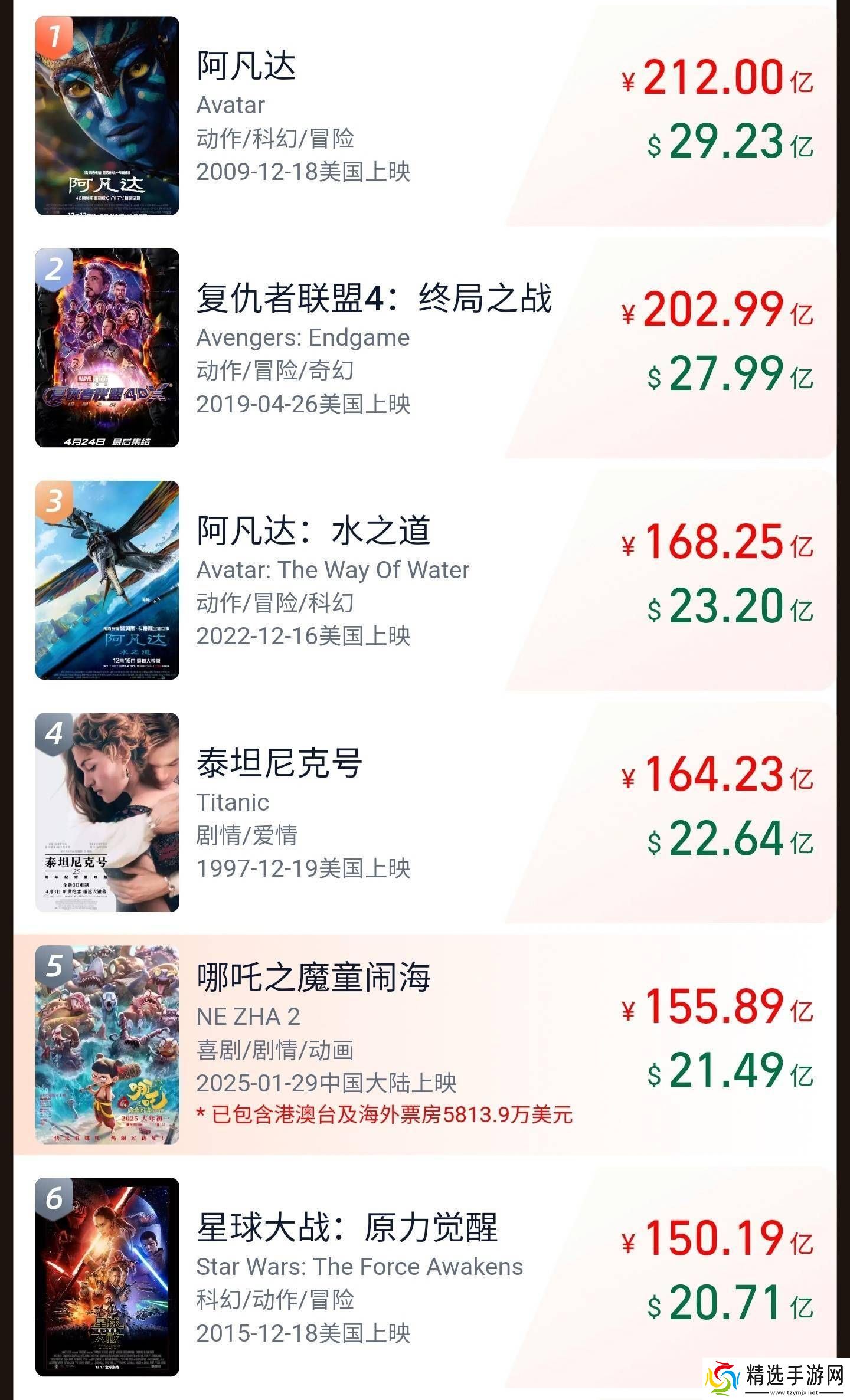 《哪吒之魔童闹海》作为一部已经上映69天的影片,在此次清明档期中依然展现出了强大的票房号召力,以超过7000万元的票房成绩稳居第三。这部影片不仅在国内市场取得了巨大成功,全球总票房更是达到了惊人的155.89亿元,使其在全球影史排名中跃升至第五位,仅次于《泰坦尼克号》的164.23亿元。