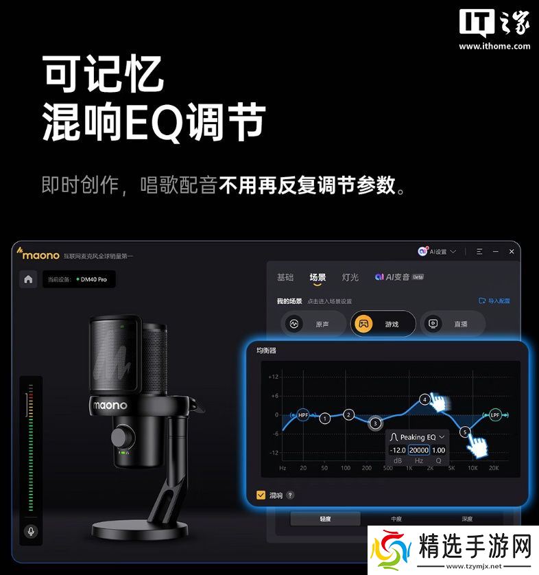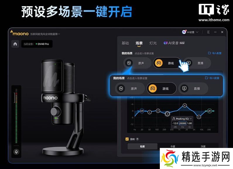Maono 闪克表示,该麦克风的配套软件中加入了“AI 语音大模型”,支持“AI 真人变声”,PRO 版本默认赠送 10 个变声角色;同时配套软件中预设游戏、直播等多种场景,可一键开启。