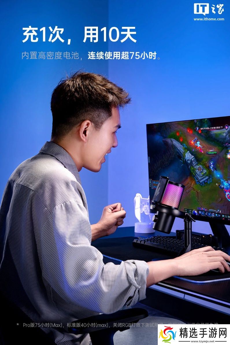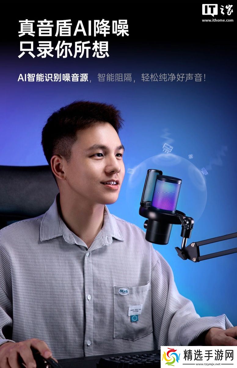 该麦克风支持 AI 降噪,可智能识别噪音源,降低环境噪音,内置“高密度”电池,可连续使用 75 小时;连接模式有 2.4G 无线 / USB 有线连接,同时包装内附有转接头,可供 iPhone 边充边用。