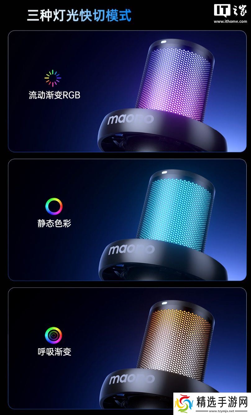 外观方面,该麦克风支持 RGB,可在流动渐变、静态色彩、呼吸渐变三种模式中切换,可在 1680 万种颜色中自由选择。