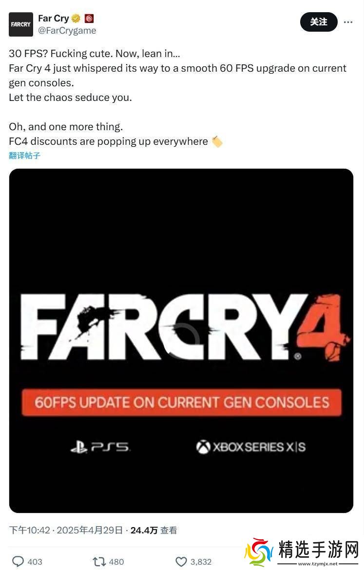 在社交媒体上,Far Cry官方账号也宣布了这一喜讯,并以幽默的方式调侃了30帧:“30帧?那太‘温柔’了。来,靠近点……《孤岛惊魂 4》已在新世代主机上实现了60帧的升级。让混乱再次席卷你的屏幕。”官方还透露,《孤岛惊魂 4》在各平台也开始了打折促销活动。