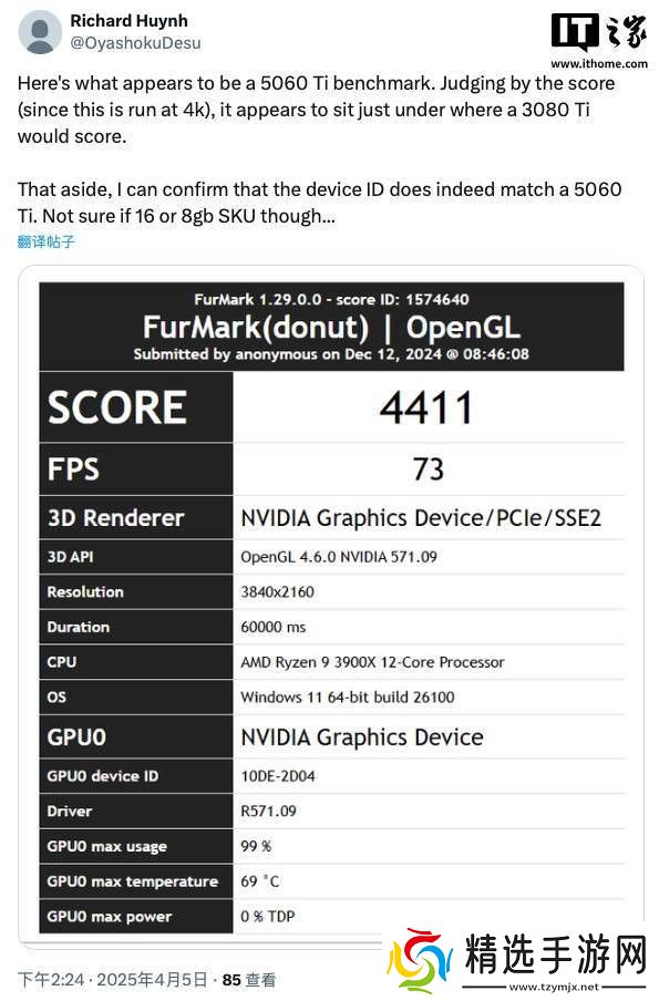 近期,有知情人士Richard Huynh在社交媒体X上透露了一则关于英伟达显卡的最新消息。据悉,英伟达RTX 5060 Ti显卡已经悄然现身Furmark跑分数据库,其最近一次的跑分成绩达到了10242分。