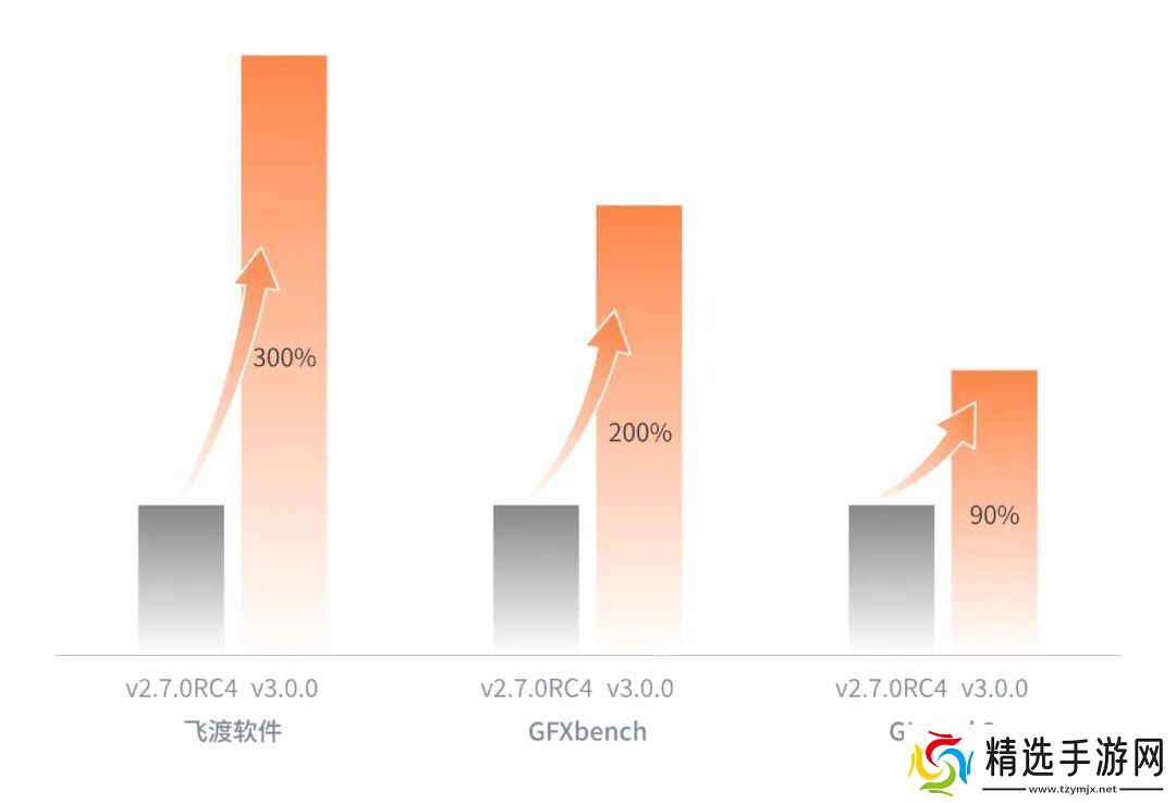与 v2.7.0RC4 版本相比,v3.0.0 版本在飞渡软件典型场景平均帧率提升约 300%;GFXbench 平均帧率提升超过 200%,GLmark2 平均分数提升接近 90%。