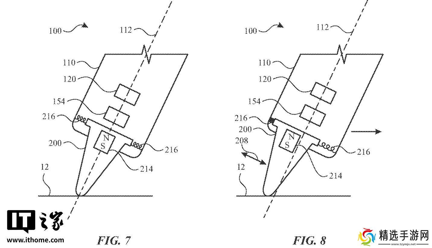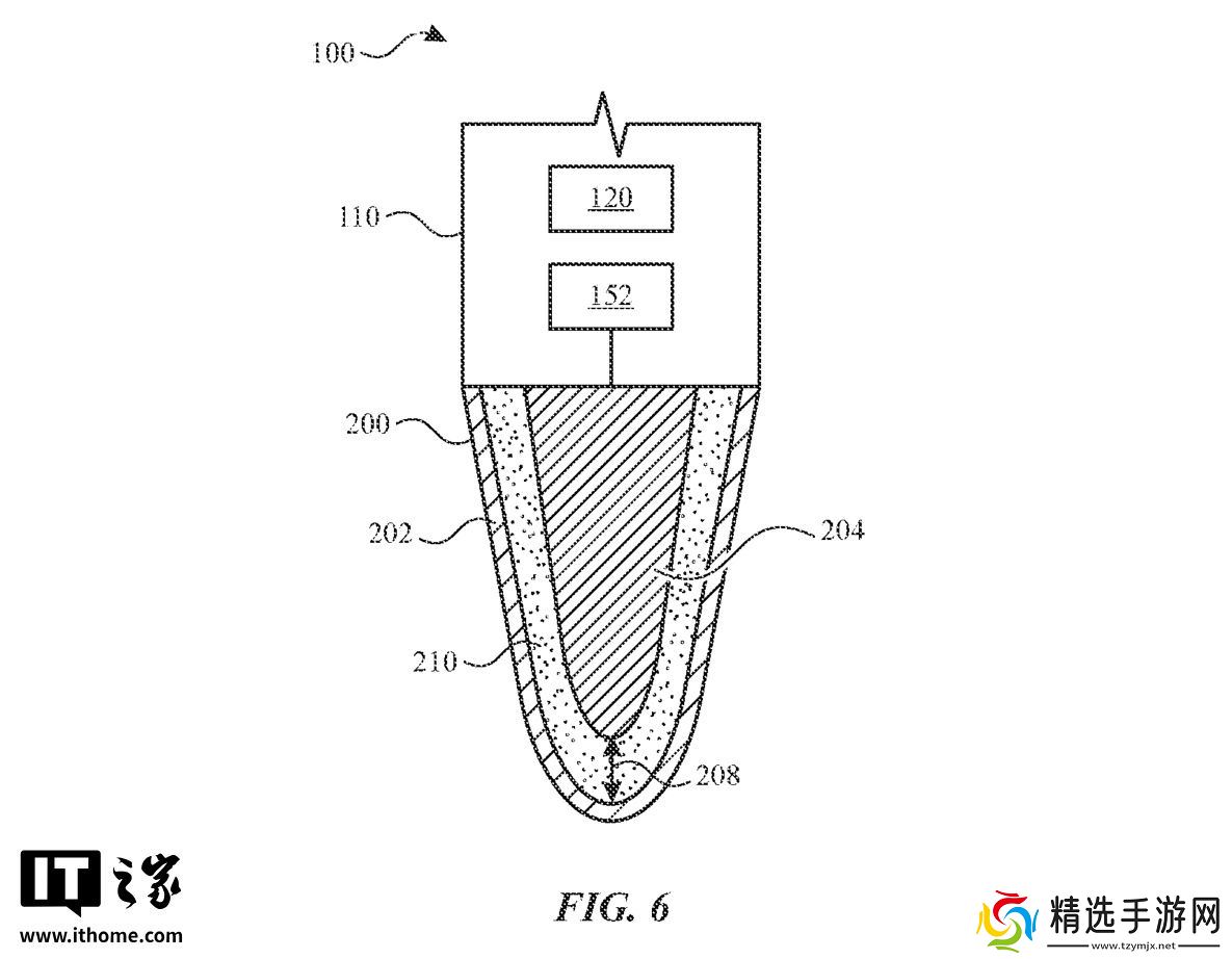 根据专利图 6,未来 Apple Pencil 的笔尖(#200)可能采用双层结构:刚性内芯(#204)包裹柔性外壳(#202),两者之间填充磁流变液(#210)。