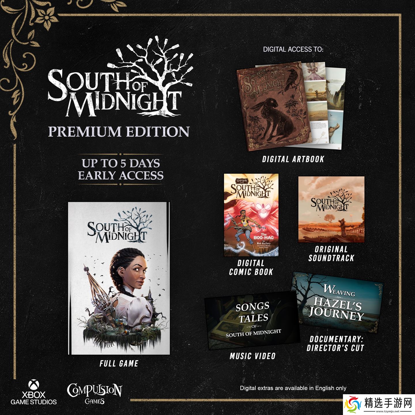 除了游戏本体之外,《午夜之南》高级版还附带一本数字艺术画册、一本数字漫画书、游戏原声音乐(数字版)、一段音乐视频以及一部关于该游戏的纪录片。