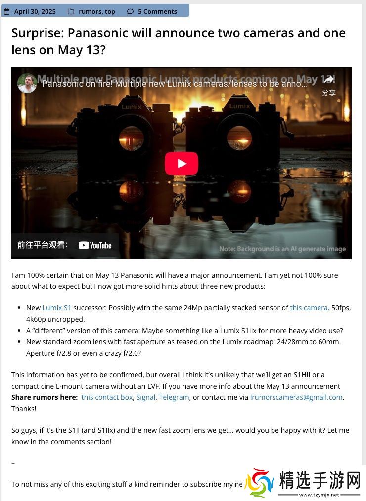 本站 4 月 30 日消息,据媒体 L-Rumors 今日报道,松下或将于 5 月 13 日举行发布会,推出两款相机和一款镜头。