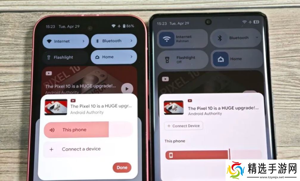 此外,Android 的媒体输出切换器也在进行重新设计。显著的变化包括将“连接设备”按钮移至更高的位置,并将药丸形音量滑块更换为新的细长式带手柄样式。