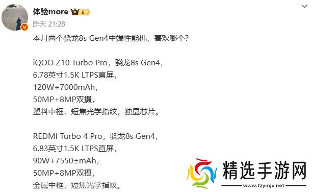 本站 4 月 5 日消息,博主@体验more 昨日曝光了本月两个骁龙 8s Gen4 中端性能机的主要规格,分别为 iQOO Z10 Turbo Pro、REDMI Turbo 4 Pro。
