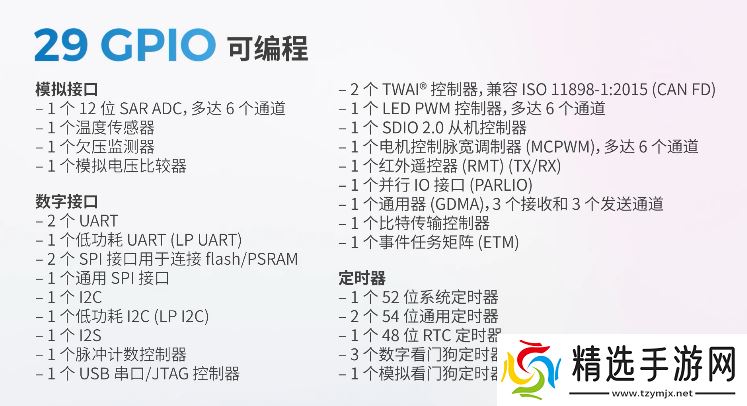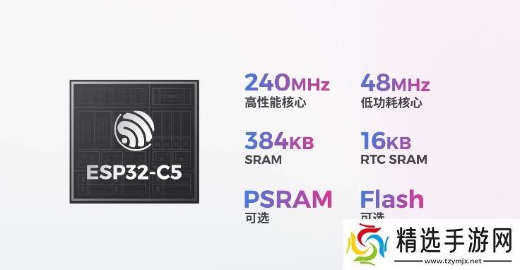 本站查询资料获悉,ESP32-C5搭载 RISC-V 32 位单核处理器,主频可达 240 MHz,内置 384 KB SRAM、320 KB ROM。它拥有 29 个可编程 GPIO,支持所有常用外围设备,SDIO、QSPI 等高速接口。