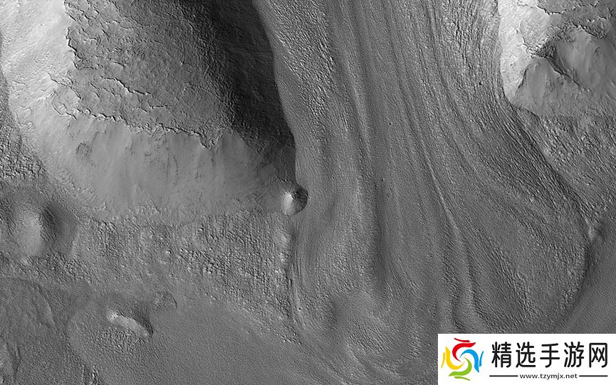 冰川状地貌 —— 在两个山脊间,大量物质似乎曾向下流动,形成冰川状地貌(Glacier-like features),这暗示火星中纬度地区过去可能存在冰层堆积。图片来源:美国国家航空航天局 /喷气推进实验室-加州理工 / 亚利桑那大学