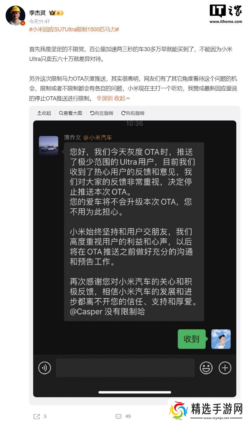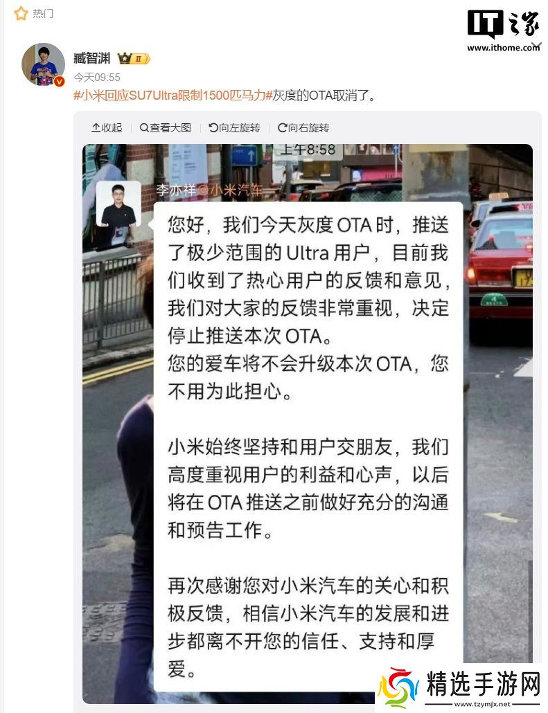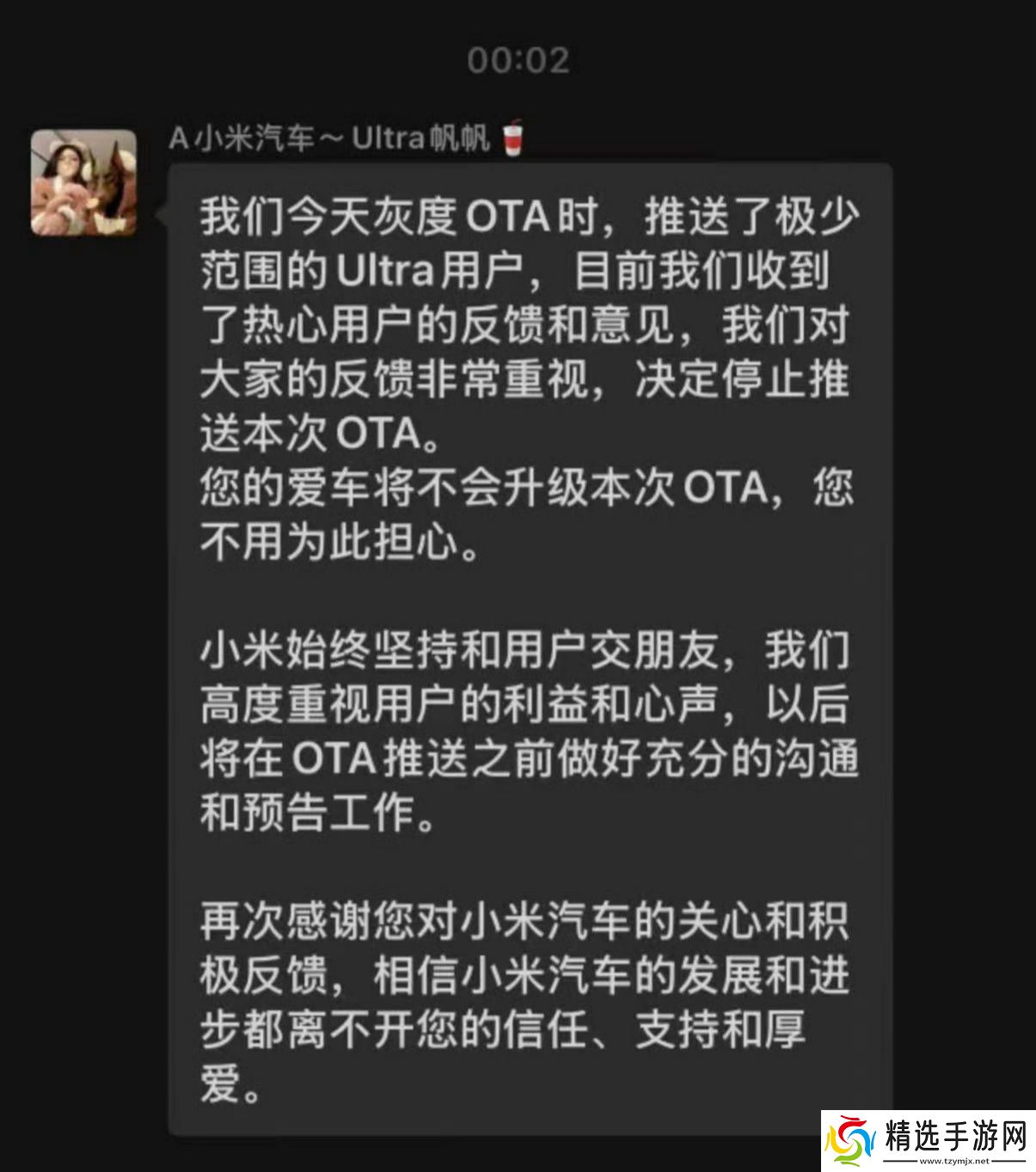 今日,多位博主晒出小米汽车人员的回复,表示推送了极少范围的 Ultra 用户,目前收到了热心用户的反馈和意见,决定停止推送本次 OTA。