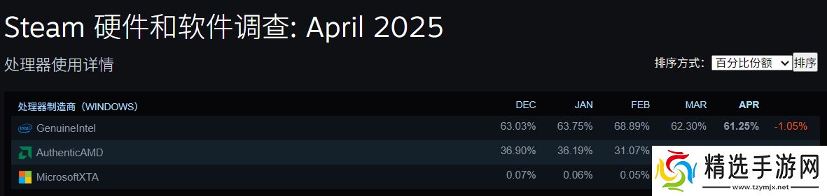 处理器方面,AMD 处理器份额提升 1.06% 来到了 38.68%,英特尔处理器份额下滑了 1.05% 来到 61.25%。