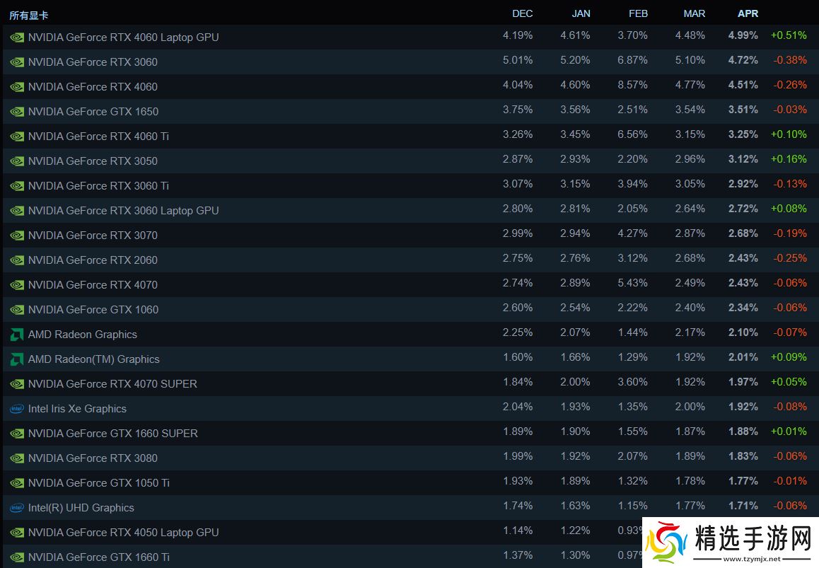 从显卡份额来看,RTX 4060 笔记本显卡的份额相比 3 月增长 0.51%,达到 4.99%,超越了 RTX 3060 和 RTX 4060 两款桌面显卡的份额。
