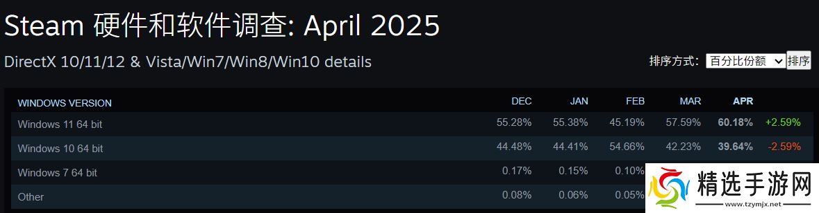 Windows 系统平台方面,Windows 11 份额继续提升,相比 3 月提升 2.59% 来到 60.18%,与此同时 Windows 10 的份额下滑了 2.59%。