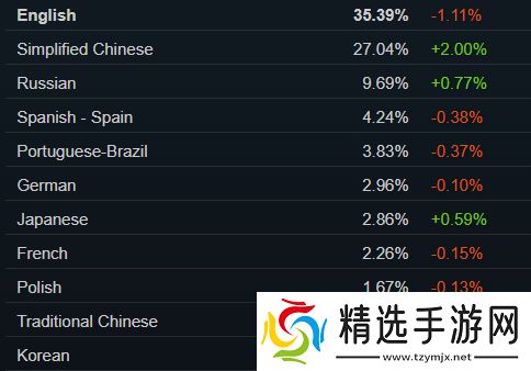 Steam 平台的玩家语言占比方面,英语在 2025 年 4 月位列第一,比例为 35.39%,不过下滑了 1.11%;简体中文比例 27.04% 位列第二,增长了 2% 的份额。
