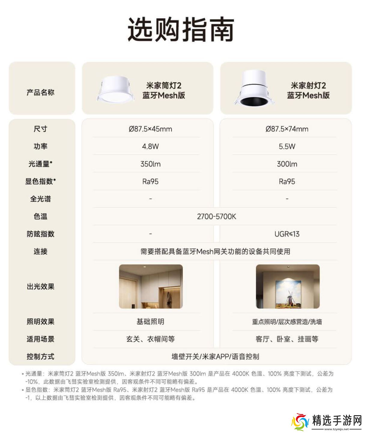 两款产品具备 Ra95 显色指数、光生物安全 RG0 豁免级,无可视频闪,并采用缓开缓灭设计,可避免瞬时强光刺激、减少视觉疲劳;支持色温亮度无级调整(2700K-5700K);筒灯光通量 350lm、射灯光通量 300lm,结构上采用雾面扩散板设计,可均匀扩散光线、减少眼部刺激;支持 0-25 度角度调节,采用 31.5mm 黑色深杯防眩设计,UGR 眩光指数不大于 13。