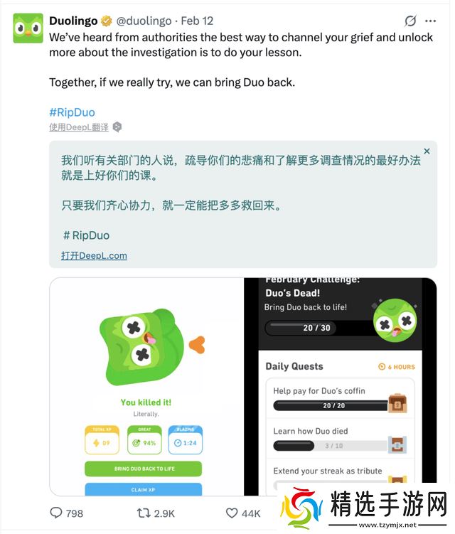 多邻国的IP形象多儿,更是以其独特的“发疯”式运营和营销,赢得了用户的喜爱。这只绿**头鹰不仅会在用户不学习时发送各种情绪化的消息提醒,还会在App图标和桌面组件上展现出不同的形态,仿佛是一个有情感、有脾气的“学习伙伴”。而多邻国近期的一次热门营销campaign——多儿“去世”事件,更是将这一IP形象推向了新的高潮。用户们纷纷参与“复活挑战赛”,通过完成学习任务来复活多儿,这一过程中不仅加深了用户对品牌的情感连接,还进一步扩大了品牌的知名度。