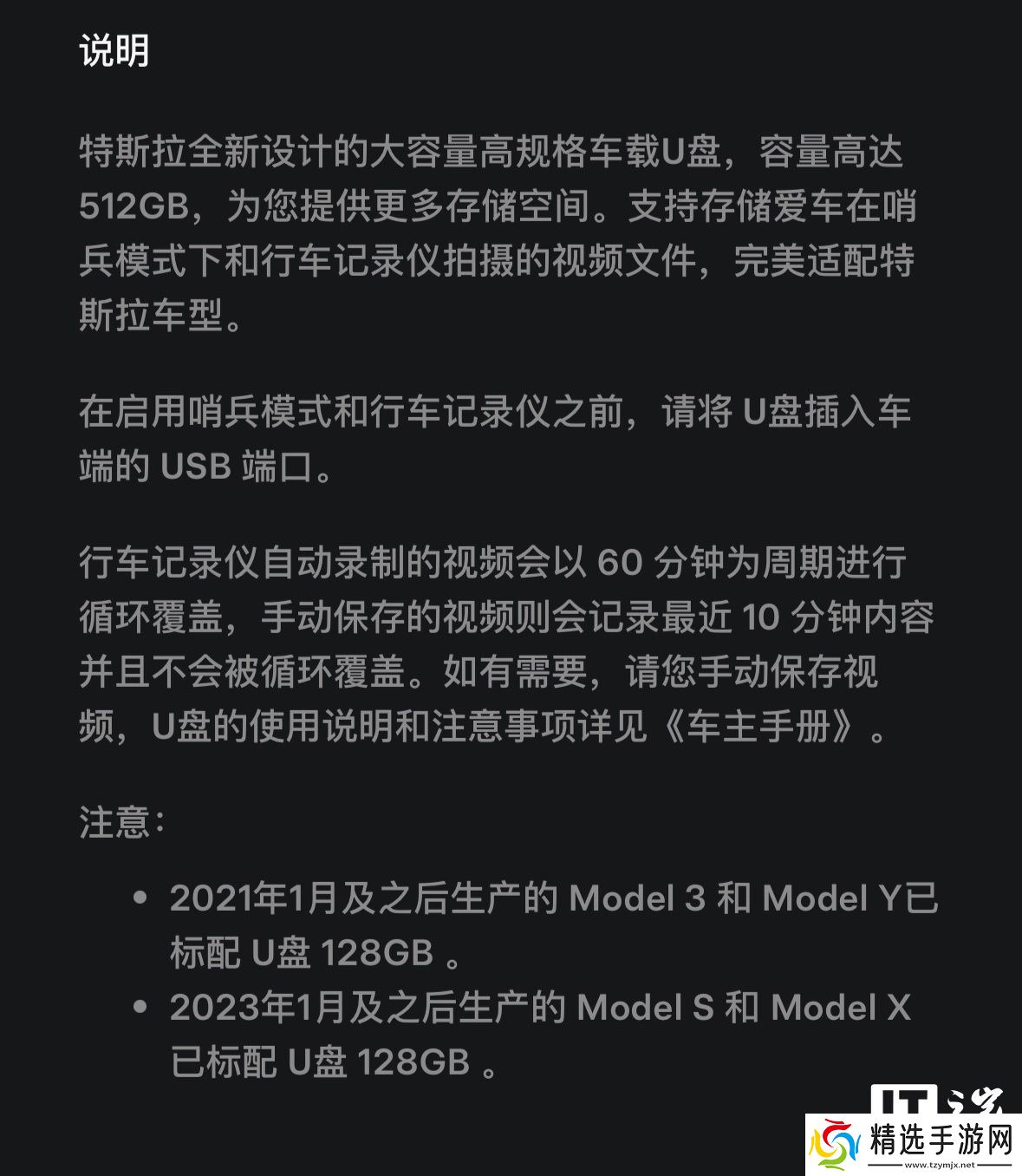 特斯拉没有公布这款 U 盘的具体读写速度等规格信息,仅表示相应 U 盘用于哨兵模式 / 行车记录仪视频录制。