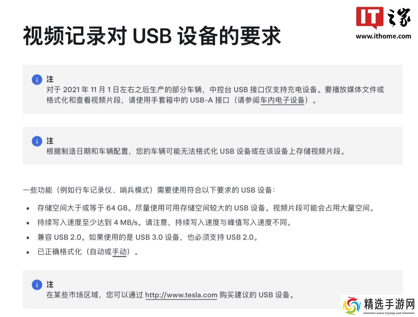 参考特斯拉中国披露的汽车“视频记录对USB设备的要求”一文,其中提到车主需要准备存储空间大于或等于64 GB、持续写入速度至少达到4 MB/s、兼容USB 2.0 的U盘才能记录哨兵模式 / 行车记录仪影像。