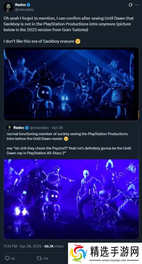 根据 X 用户 Radec 的发现,《直到黎明》的 PlayStation Productions 开场中未再出现麻布仔,而在之前游戏的开场中,麻布仔仍然在场。