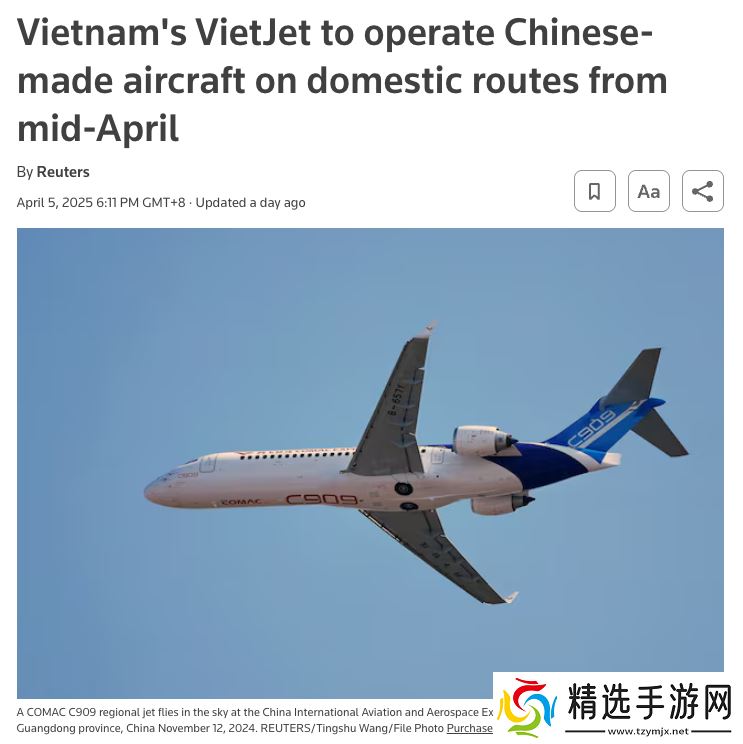 本站 4 月 6 日消息,据路透社当地时间 4 月 5 日报道,路透社看到一份公司声明:越南越捷航空将于 4 月中旬首次在国内航线上运营中国制造的中国商飞短途支线客机 C909。
