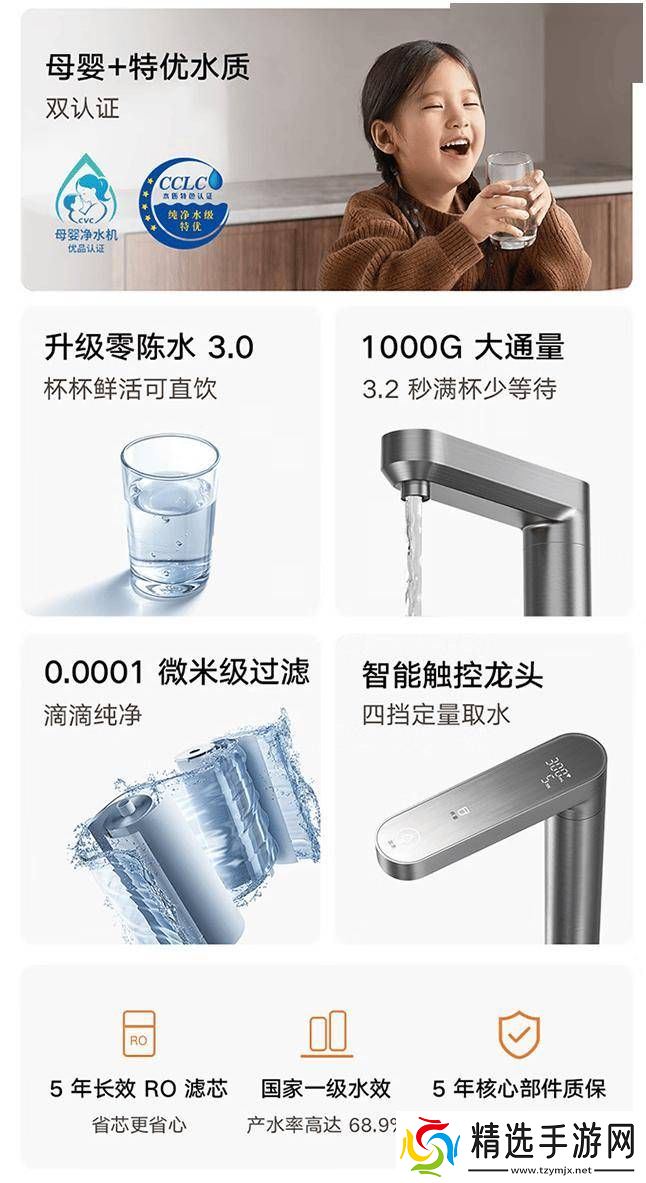 智能功能也是这款净水器的一大亮点。其智能大屏龙头经过了10级电镀抗腐测试,具备IPX7级专业防水功能,可以实时显示水质和水量等信息。用户还可以根据需要选择四档常用水量。龙头设计超大口径,适配大通量需求,并内置了精密整流器。