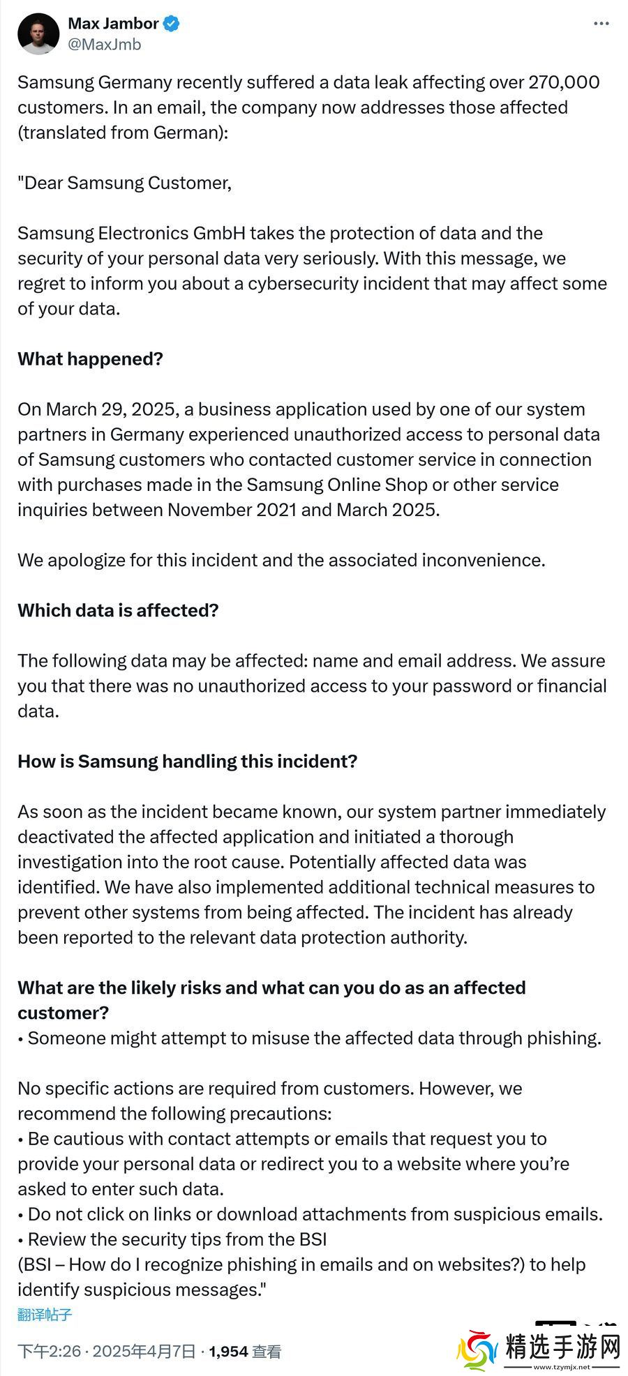 本站 4 月 9 日消息,科技媒体 SamMyFans 昨日(4 月 8 日)发布博文,报道称三星于 3 月 29 日出现数据泄露事件,暴露了 27 万客户的个人数据,目前已通过邮件方式,通知受影响的德国用户。