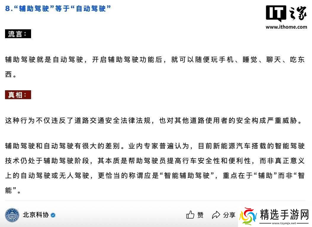 近期,北京市科学技术协会携手北京市委网信办及首都互联网协会,指导北京科技记者编辑协会与北京地区网站联合辟谣平台,联合揭晓了4月份的“科学”流言榜单。榜单上的一则流言引起了广泛关注:部分车主误以为辅助驾驶等同于自动驾驶,认为开启该功能后便可以自由地进行诸如玩手机、睡觉、聊天或吃东西等活动。