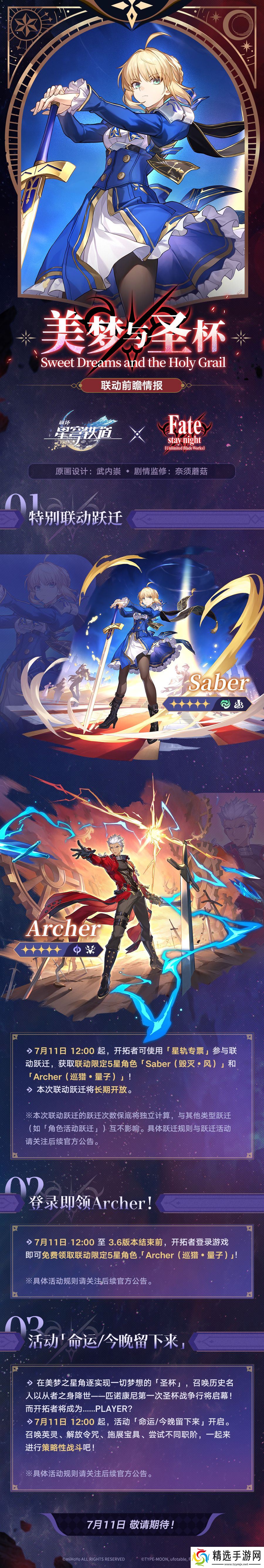 其中,联动限定 5 星角色 Archer 登录即送,而 Saber 需要玩家使用「星轨专票」参与抽取,联动卡池长期开放(保底独立计算)。官方资料显示,Saber 为毁灭命途风属性,Archer 为巡猎命途量子属性。