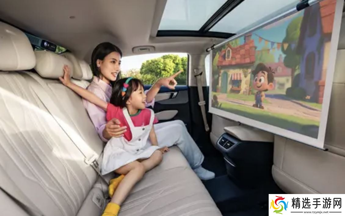 该静享巨幕投影用于汽车后排使用,屏幕尺寸为 40 英寸,投影系统内置多款主流视频 App,支持手机、电脑等设备无线投屏,支持移动电源供电。