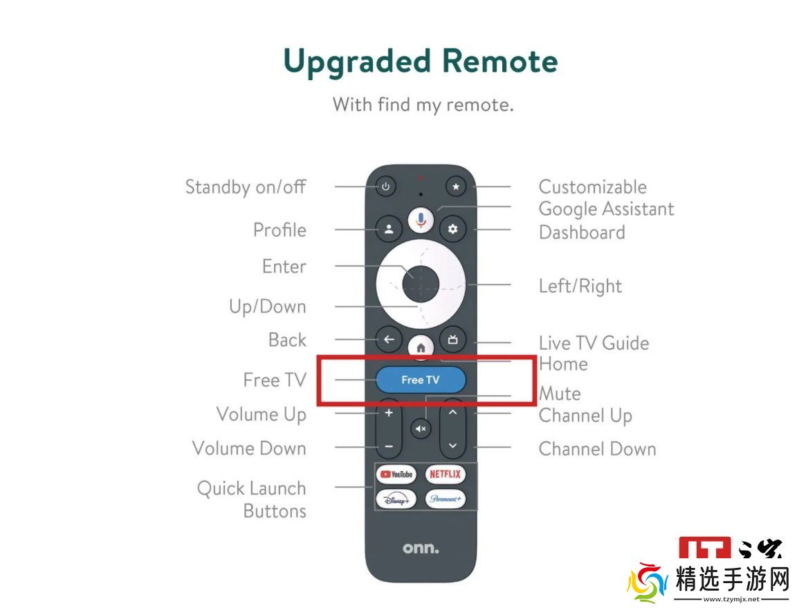 值得注意的是,目前已有部分 Google TV 设备的遥控器配备了相应按钮,例如沃尔玛的 Onn 4K Pro,其遥控器上的“Free TV”按钮大而醒目,采用亮蓝色,设置在遥控器中部。