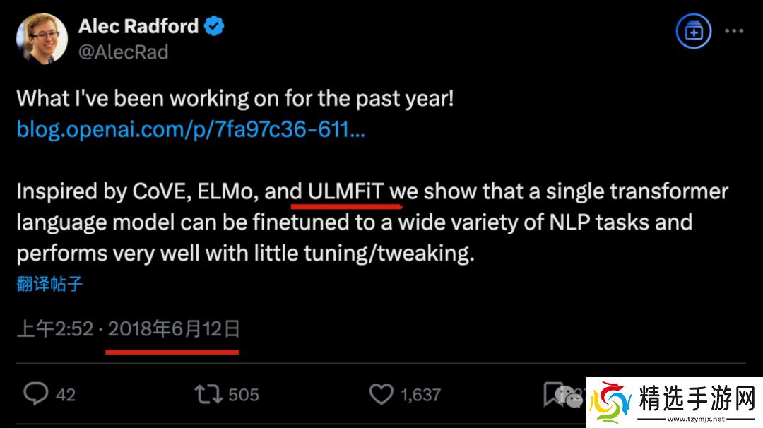 甚至 GPT-1 的一作 Alec Radford,在发表 GPT-1 时也公开承认过 ULMFiT 是灵感来源之一。