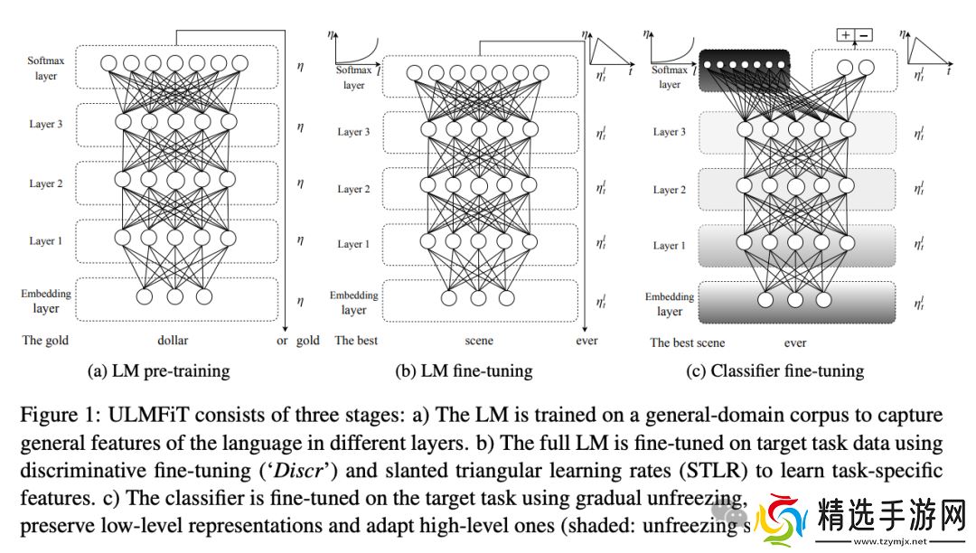 最后再来看 ULMFiT,其名字代表在文本分类任务微调的通用语言模型(Universal Language Model Fine-tuning for Text Classification)。