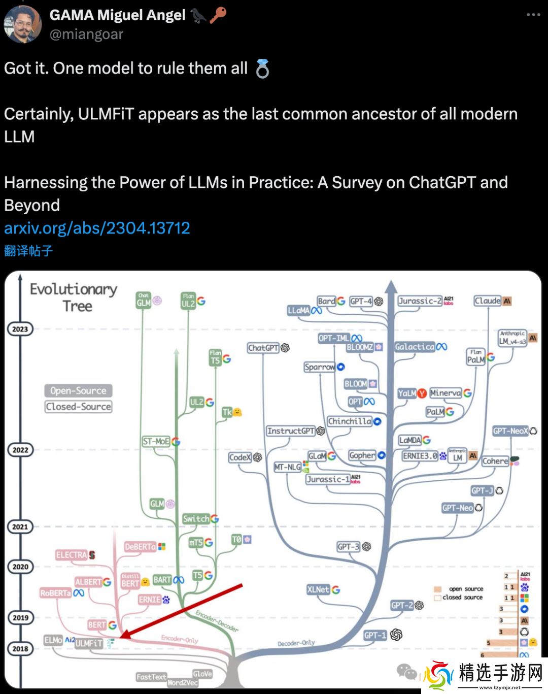 有人搬出综述论文,指出从“遗传学”视角看,ULMFiT 是所有现代大模型“最后的共同祖先”。